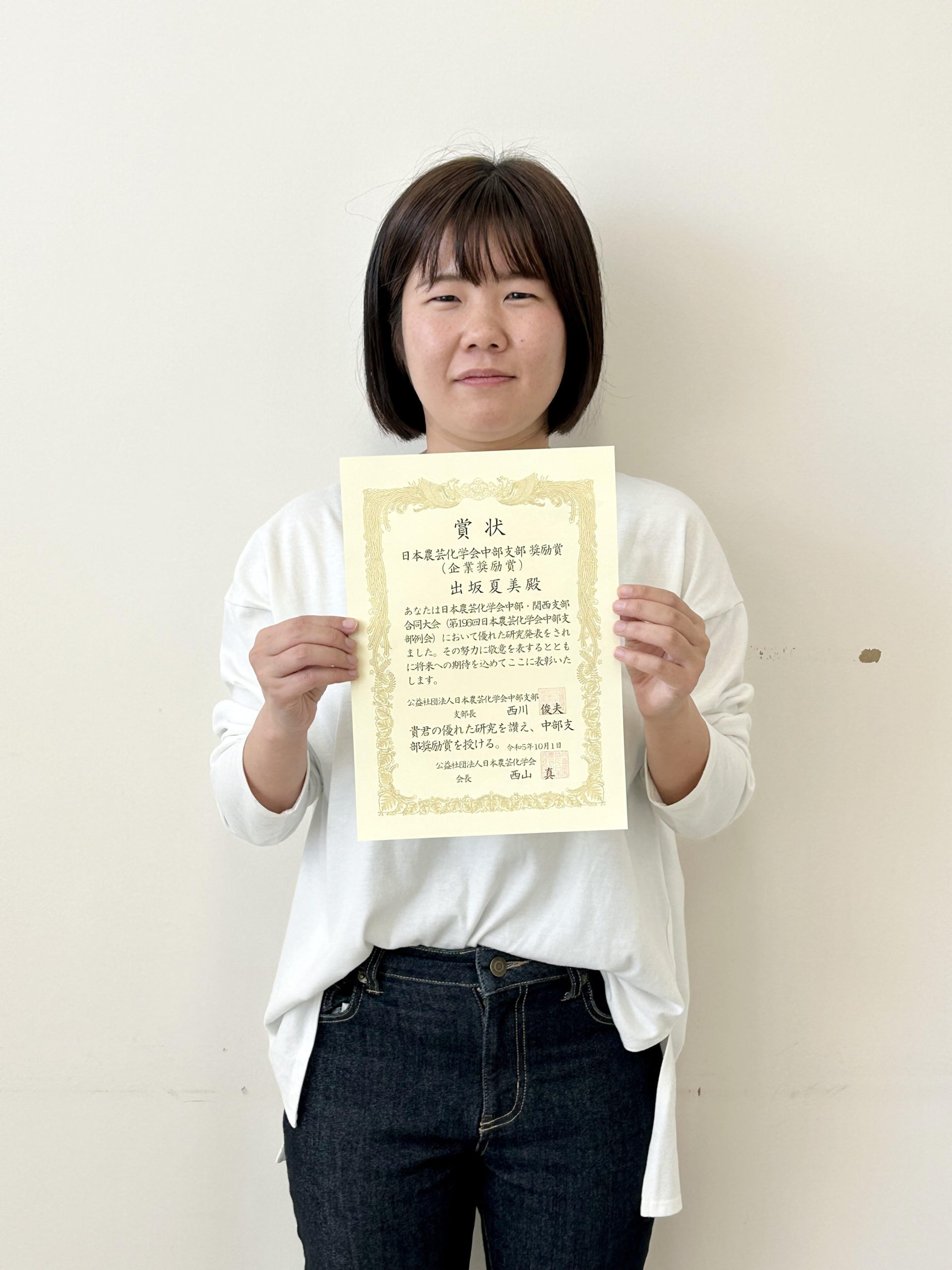 大学院・博士後期課程生物機能開発科学専攻3年の出坂夏美さん(指導教員:食品科学科 東村泰希准教授)が、9月30日から10月1日に開催された2023年度日本農芸化学会中部・関西支部合同大会において、“線虫を用いた腸管透過性の新たな評価法の開発”というタイトルで発表し、企業奨励賞を受賞しました。出坂さんの研究成果は、腸の健康状態を示す指標のひとつである透過性の程度を、モデル生物である線虫を用いて評価する実験系を開発したものです。腸の透過性とは、きちんと消化されたものだけを腸が吸収し、腸内を保護するためのバリア機能です。今後のさらなる研究展開により、腸管透過性を指標とした食品成分の機能性評価などに応用することが期待されます。