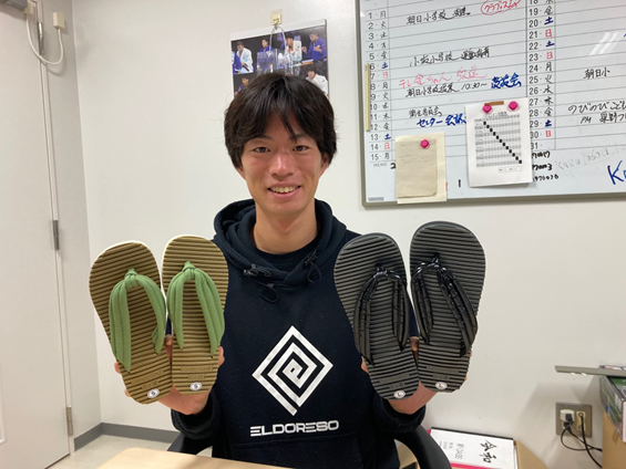 10月29日(日)に開催された「第9回金沢マラソン」で男子初の連覇を達成したプロランナー福村挙太選手(砂山商事)が、教養教育センターの宮口和義教授の研究室を訪れました。パリ五輪出場を目指す彼は、今年から姿勢矯正サンダル「武王」を、トレーニングの合間に愛用しています。このサンダルは宮口教授が神戸ラッキーベル社と共同開発したものです。身体に負担をかけない自然なランニングフォームを目指す彼は、「大手メーカーから色んなサンダルが出ているが、このサンダルが一番いい。特に天板の傾斜が自然な重心移動を導いてくれる」ととても気に入ってくれています。宮口教授は、福村選手とは今後もしっかりタッグを組んで、市民ランナーや体育授業の支援等も行っていくと述べています。