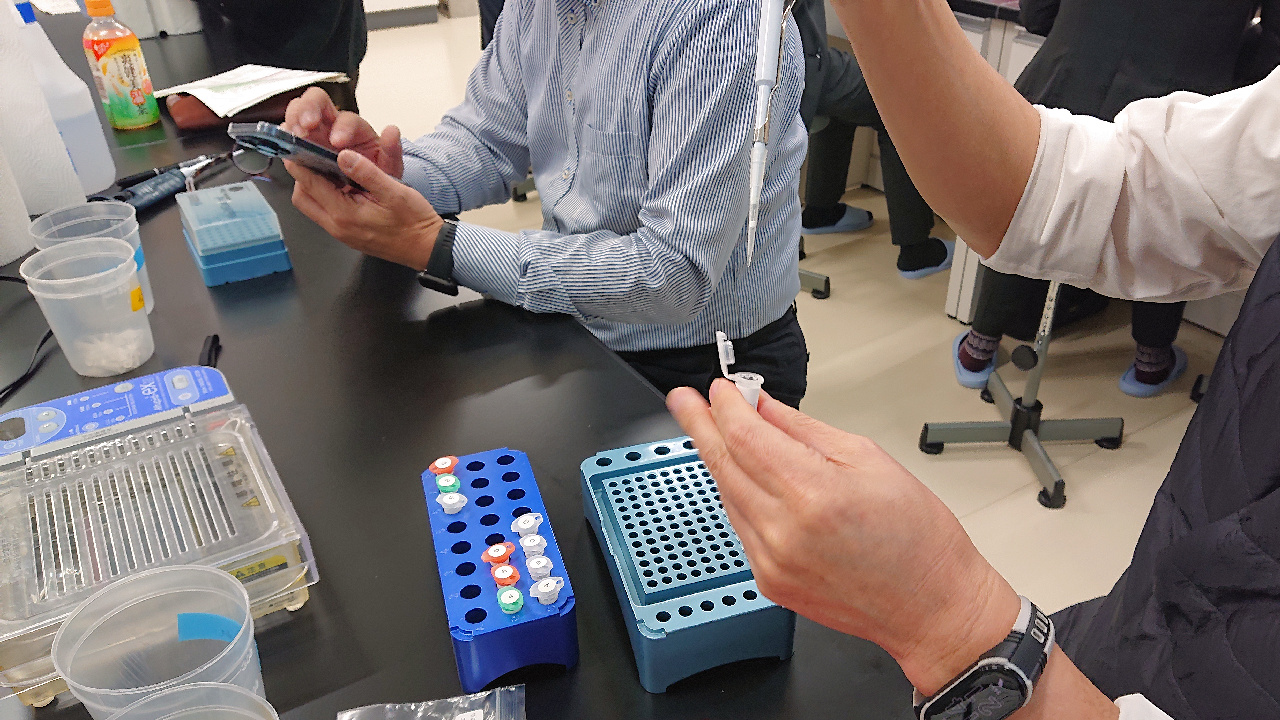12月28日(水)に本学で、県内高校で生物を教える先生方の研修会が開催されました。日頃は教える立場の先生方がご自身の研鑽のためにと仕事納めの日に企画された研修会で、14名の先生が参加されました。生物資源工学研究所の中谷内修講師の指導で、エンドポイントPCR法とリアルタイムPCR法によって溶液中のウイルスDNAの濃度を比較する実験を行い、PCR法によるDNA定量の原理について学ばれました。みなさん、真剣なまなざしで実験に取り組みつつ、学生の頃に戻ったように楽しんでいらっしゃいました。ほぼ同じ内容の実験を高校の生徒さんにやっていただくと多少うまくいかないところも出てくるのですが、先生方は全員とても綺麗な結果を出されていました。
