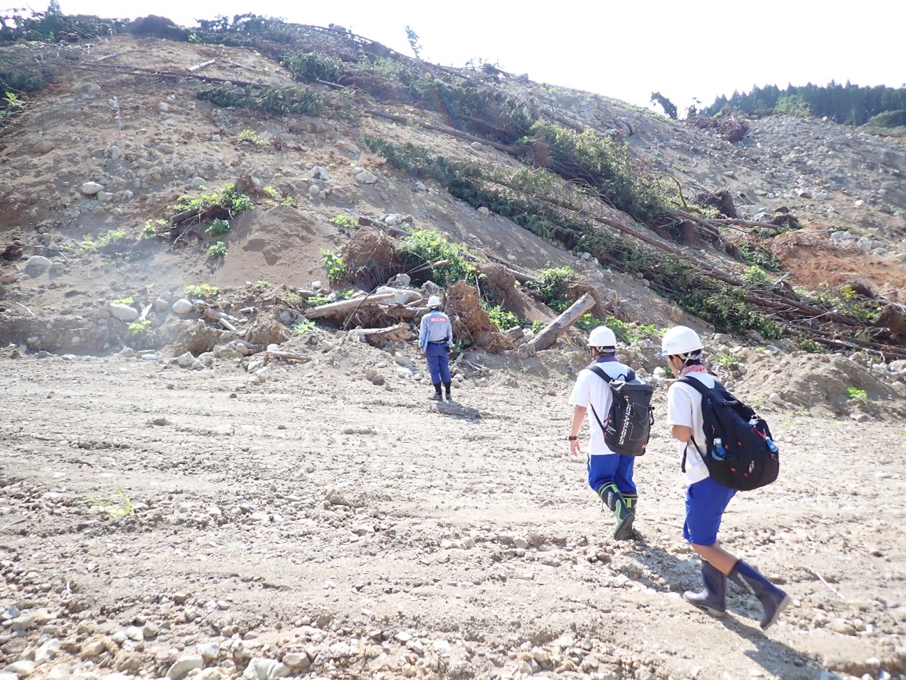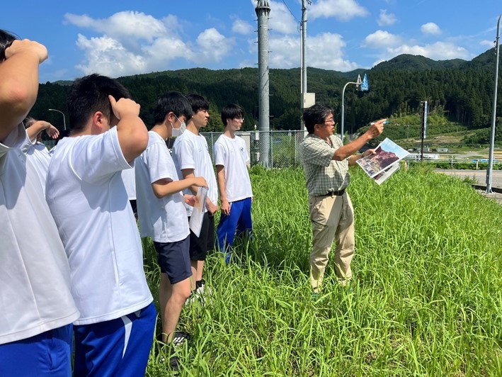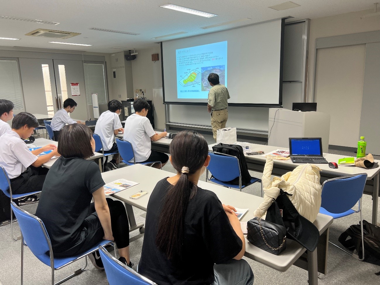 午前中は、のと里山空港ビル内にある、大学コンソーシアム石川能登分室を利用して、環境科学科の大丸教授が地すべりの地形とメカニズム、そして地域とのかかわりについて講義を行いました。午後は輪島市街地の南方、市ノ瀬地区で発生した大規模地すべりの発生現場を訪れ、国土交通省能登復興事務所担当者と大丸教授から、市ノ瀬地すべりの概要と川が土砂によってせき止められた土砂ダムの対策について説明を受けました。高校生達は地震によって引き起こされた大規模地すべりを目の前にして、そのスケールに大きさに驚いた様子でした。