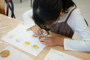 市販のパン酵母を生やしたプレート(培地)を「見て」「香りを嗅いで」「顕微鏡で観察して」、パン酵母が真核生物で納豆菌や乳酸菌が原核生物であること、微生物がとても小さいこと、ものすごい速度で増殖すること(1個の細胞が2日間でコロニーを形成して見えるようになること)を「知って」、お手本となる下絵の上に置いたプレート上に、下絵に沿って微生物を植え、それが増殖することで絵として見える「アート」を体験しました。参加者全員がマイクロピペットの操作にも挑戦しました。また、納豆のネバネバ成分の納豆菌、ヨーグルトの中の乳酸桿菌も顕微鏡で観察しました。保護者の方にも積極的に参加して頂きました。