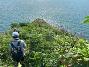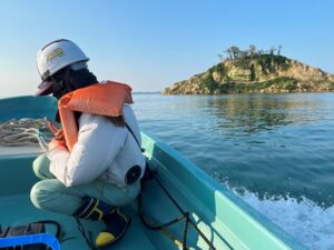 そこで2025年9月1日、石川県立大学や石川県の自然環境課、林業試験場、のと海洋ふれあいセンター、金沢大学能登学舎、民間の測量会社などから8名の研究者・技術者が調査チームを結成。ボートで島に渡り、森の再生状況を調査しました(写真2)。
