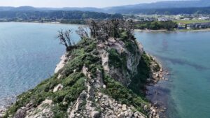 しかし、2024年元日に発生した能登半島地震で島の後ろ半分が大きく崩れ、その姿は一変しました(写真1)。島の上に広がっていた緑豊かな森も被害を受け、枯れ木が目立つ荒れた風景となり、地元の人々から心配の声が上がっていました。