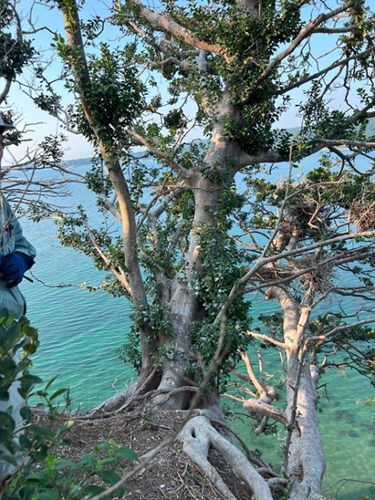 急斜面を登って島の上に立つと、直径50cmを超える大きな常緑樹(タブノキやモチノキ)は葉を落としていましたが、幹からはたくさんの新しい芽が出ていました(写真3)。また、崩れ落ちた岩のすき間からは、アカメガシワやカラスザンショウといった若い木々が育ち始めていました(写真4)。