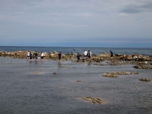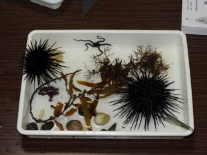 まず、里海生態系を構成する動植物の形態や生息環境の特徴を観察し、分類法の基礎を学ぶとともに、自然海岸保全の重要性を理解しました。また、照葉樹林を対象に森林構造や林床植生を観察し、森林生態系への理解を深めました。さらに、水生動物とその生息環境の調査を行い、河川や水路を利用する水生生物の多様性について学び、加えて、河口域を海水が遡上するのに伴って河川水の水質がどのように変化するかを観測しました。