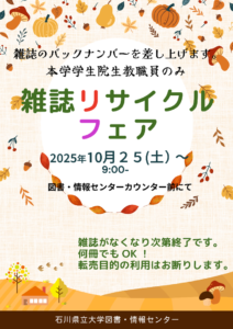 石川県立大学 > お知らせ・新着情報 > 雑誌リサイクル開催のお知らせ