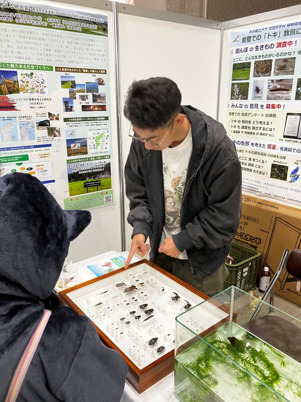 本ブースでは、研究や活動を紹介するポスターに加え、能登の希少な水生昆虫(ゲンゴロウなど)の生体や標本を展示。数百名を超える来場者で賑わい、学生たちは子どもや家族連れに熱心に説明しました。