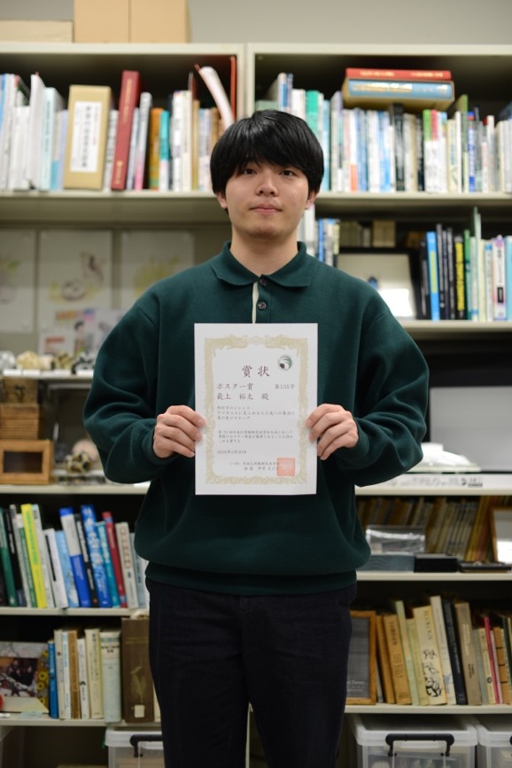 大学院・博士前期課程生産専攻1年の最上裕太さん(指導教員:弘中満太郎教授)が、第70回日本応用動物昆虫学会大会(2026年3月28日〜30日)において、「外灯下のジレンマ:アマガエルに見られる人工光への集合と負の光マスキング」というタイトルで発表を行い、ポスター賞を受賞しました。