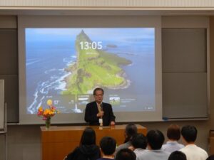 2026年4月21日(火)、K219大講義室にて「能登半島地震復興支援研究プロジェクト令和7年度報告会」が開催されました。当日は入学間もない1年生を対象としましたが、2~4年生や院生・教職員も加わり全体で100名以上が聴講し、大講義室がほぼ満席となるほどの盛況となりました。