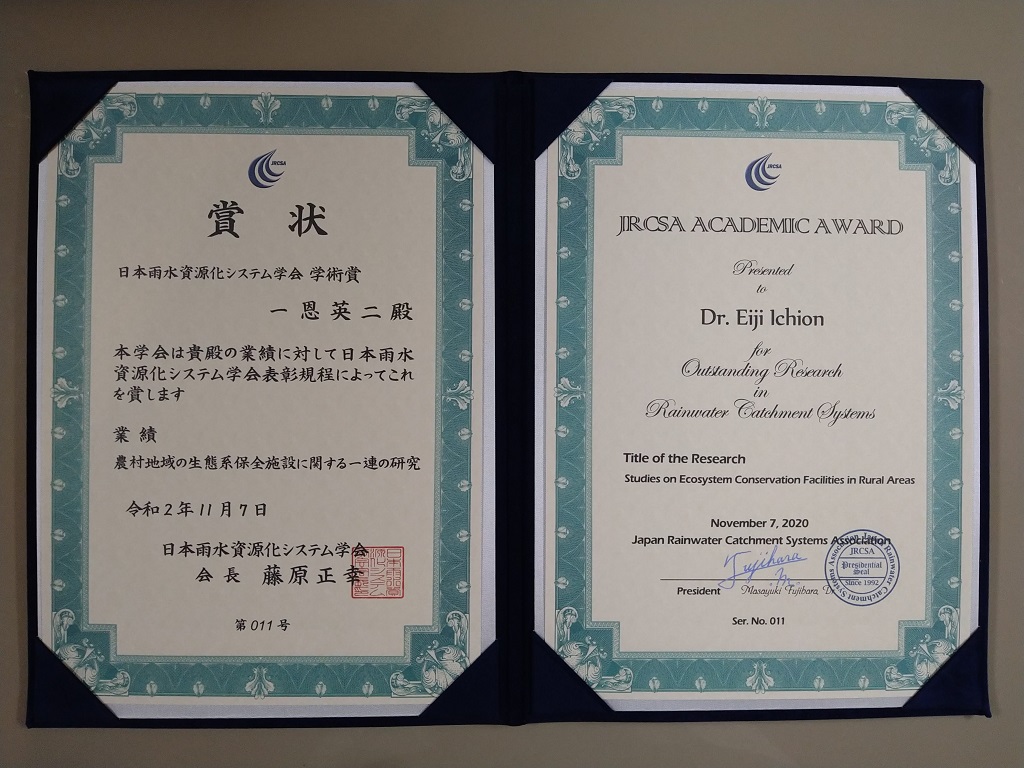 本学環境科学科の一恩英二教授が、2020年11月7日にWEB開催された第28回日本雨水資源化システム学会大会において、受賞業績「農村地域の生態系保全施設に関する一連の研究」で学会賞(学術賞)を受賞しました。一恩教授の対象業績は、2015~2020年の6年間に同学会のJournal of Rainwater Catchment Systemsに同氏が筆頭著者またはコレスポンディングオーサーとして掲載された9編の論文です。対象論文の内訳は、魚道関係が6編、食物網、HSIモデル、ビオトープに関するものが各1編でした。また、一恩教授は、平成21年度大会運営委員会事務局、平成26年度大会運営委員長、令和2年度大会運営委員会委員長(WEB開催)、平成28年度より理事、令和元年度より学会副会長として同学会に貢献しています。