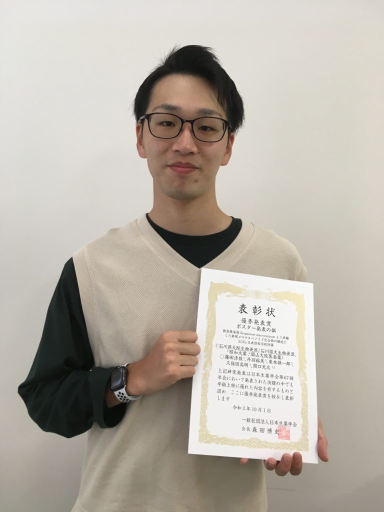 本学大学院・博士前期課程食品科学専攻1年の篠田清哉さん(指導教員:食品科学科 関口光広准教授)が、9月19日から20日に開催された日本生薬学会第67回年会において、“能登産海藻Sargassum macrocarpumより単離した新規メロテルペノイド化合物の構造とAGEs生成阻害活性評価”というタイトルでポスター発表し、優秀発表賞を受賞しました。篠田さんは、能登半島九十九湾で採集した褐藻ホンダワラ科のノコギリモクから、終末糖化産物(タンパク質と糖が結びつくことで生成される物質)の生成を阻害する新たな化合物を単離し、その構造を明らかにしました。今後のさらなる研究展開により、能登産海藻の有効利用および終末糖化産物が関与する生活習慣病等の予防に貢献することが期待されます。