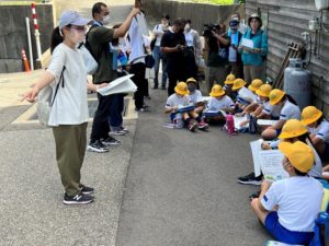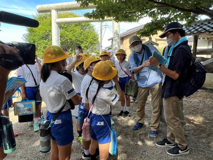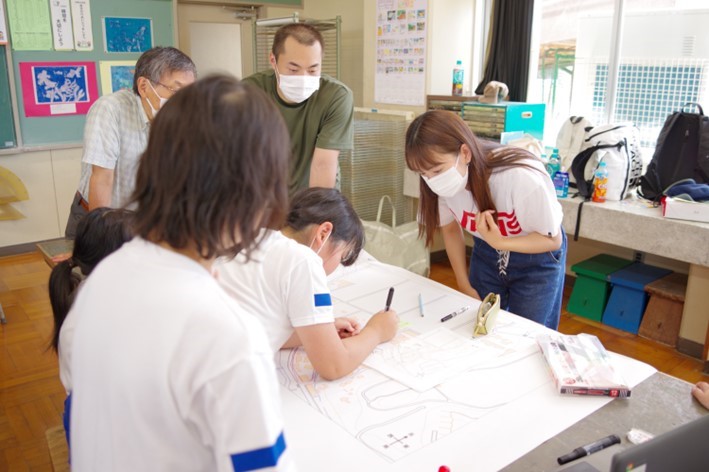 まず、全員で、小学校の周りの水路や河川、崖地などを見て歩きました。近くの川では水位を監視する水位標やビデオカメラ、川から水を取り入れる水門と水路の役割について、小高い神社の境内では地形について学生と教員が説明しました。水田では水路の役割や豪雨時の注意点などを説明しました。小学生はタブレットパソコンを使って危険と感じた個所を撮影し、地図に書き込む作業を行い、発表しました。普段見慣れた場所でも、災害時には危険な場所になることを理解することができました。学生たちも、災害について学んだことを小学生に説明することで、より理解が深まったと思われます。