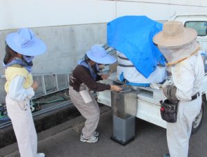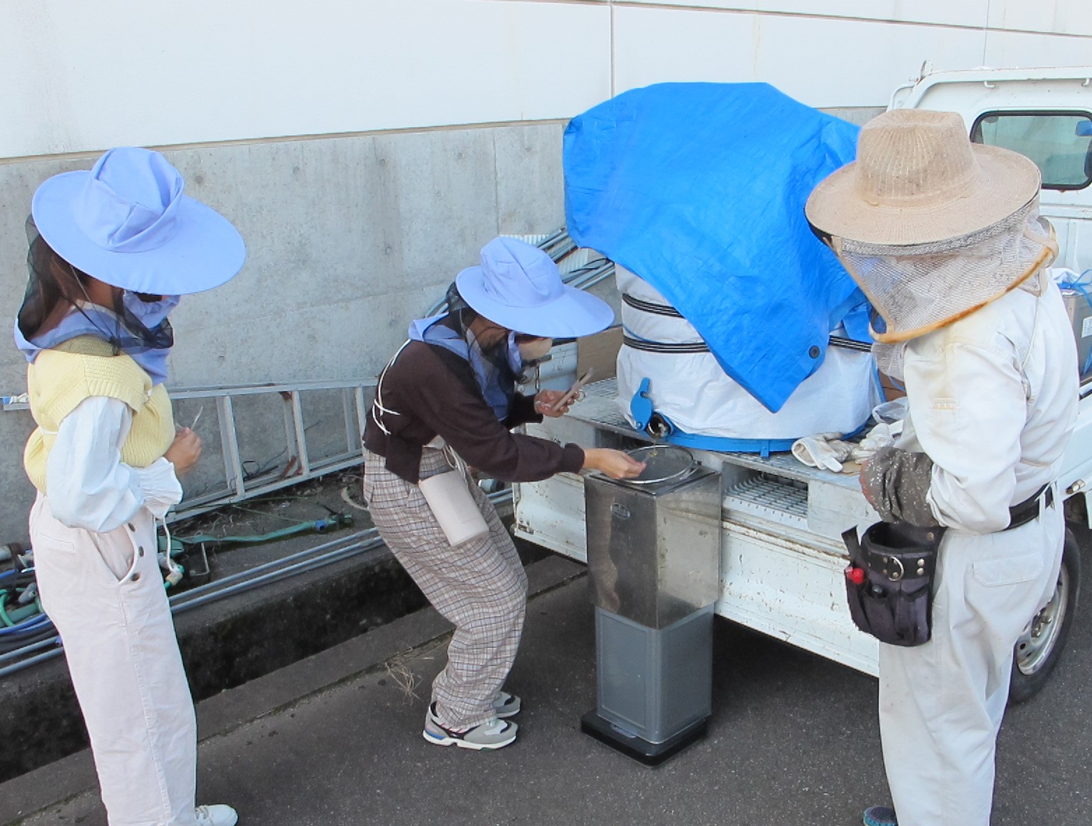 ポケゼミ「サツマイモの花プロジェクト」では、地元野々市市の蜂蜜生産者しずく工房と共同でサツマイモの花からの蜂蜜採取に挑戦しています。10月16日にしずく工房の職員からセイヨウミツバチの管理や採蜜方法などの説明を受けた後、巣箱から蜜枠と巣枠を取り出して蜂蜜を搾り出しました。8月後半以降は天候不順が続いたことから収量は多くありませんでしたが、初めて食べるさつまいもの花の蜂蜜に、「甘い」、「まろやか」、「優しい味」と皆一様に感激したようでした。その場で、糖度を計測したところ平均80.1度あり、商品としても十分な糖度であることがわかりました。今回、採蜜したサツマイモの花の蜂蜜は、しずく工房の協力の下、10月30日(日)に本学でおこなわれる第18回響緑祭(学園祭)にて販売します。