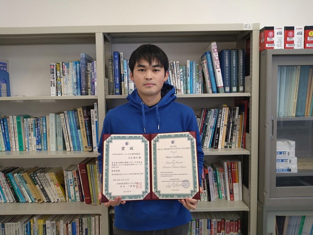 大学院環境科学専攻2年生の立花陸斗さん(主指導教員:大丸裕武教授)が、2022年10月に開催された第30回日本雨水資源化システム学会大会(岐阜大学サテライトキャンパス)において、「管水路型魚道におけるタナゴ亜科魚類の遡上特性」というタイトルで発表し、優秀発表賞を受賞しました。本研究は、まだ研究事例が少ない管水路型魚道(異なる水面高さの水域間を魚が移動できるように、水が充満して流れるパイプでつないだ魚の通路)の実験装置において、流れの速い河川や水路にも対応できるタイプの魚類ヤリタナゴと緩い流れでのみ生活するタイリクバラタナゴを用いて2種の遡上特性(能力など)の差を明らかにしたものです。タナゴ類の多くは生息適地と繁殖場所が異なり移動が不可欠です。そのため、堰などによる移動経路の分断が原因の一つになって、在来種の多くが絶滅危惧種になっています。本研究は、タナゴ類の移動を支援する安価な管水路型魚道の開発の端緒となる研究で、タナゴ類の保全に役立つものと考えられます。