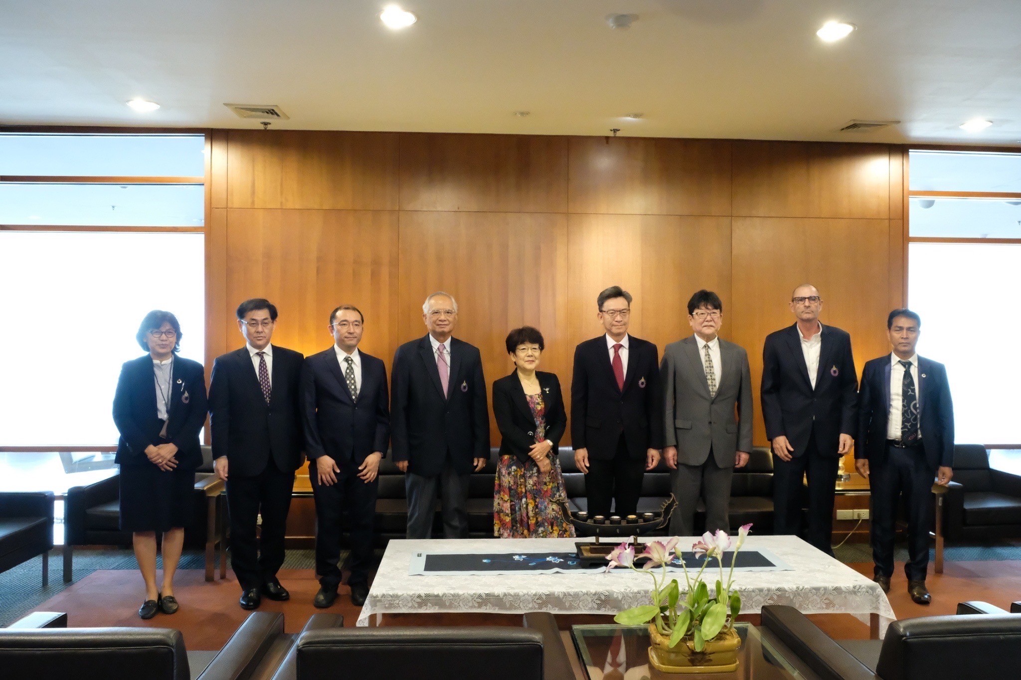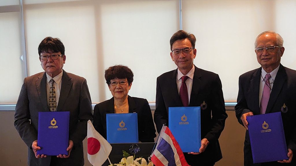 令和5年1月17日(火)に、タイのランシット大学において、本学とランシット大学との学術交流協定の締結式が執り行われました。本学からは、西澤学長の他、産学官連携学術交流センター長の榎本教授、食品科学科の小栁准教授及び河上事務局次長が参加しました。